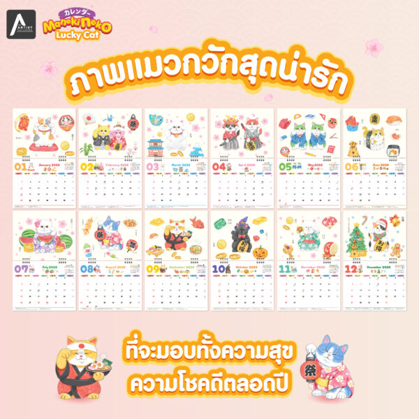 ปฏิทินตั้งโต๊ะ Manekineko Lucky Cat นำเสนอคาแร็กเตอร์สุดน่ารักของ Maneki Neko หรือแมวกวักนำโชคจากญี่ปุ่น มาพร้อมคอสตูมสีสันสดใสและ Lucky Items เสริมโชคลาภในด้านต่าง ๆ ตามความเชื่อของประเทศญี่ปุ่น ที่จะมอบทั้งความสุขและความโชคดีตลอดปี ภาพประกอบโดย “May Mood” ศิลปินนักวาดภาพเทคนิคสีไม้กึ่งเสมือนจริง
