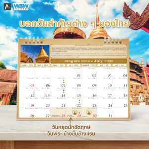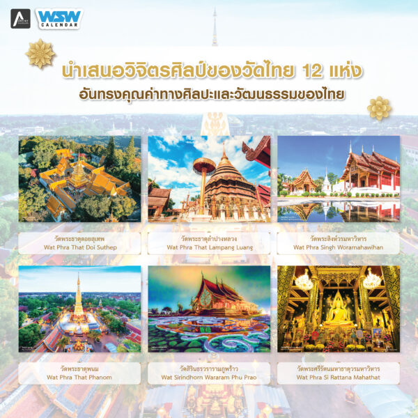 ปฏิทินตั้งโต๊ะ วัดไทย เป็นงานออกแบบภายใต้ Concept “Thai Temples : Timeless World Heritage” หรือ “วัดไทย มรดกโลกเหนือกาลเวลา” นำเสนอความงดงามและคุณค่าทางศิลปะวัฒนธรรม และศรัทธาของวัดไทย ผสมผสานความเป็นมรดกโลก จำนวน 12 แห่ง โดยถ่ายทอดผ่านภาพถ่ายในมุมที่งดงามและอลังการ